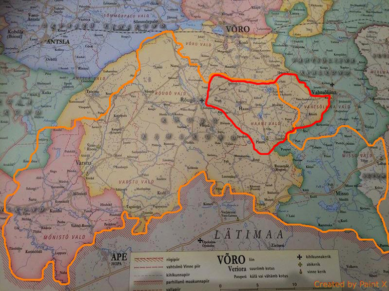 Kõllasõ joonõ seen – vahtsõnõ Haanjamaa vald. Verevä joonõ seen – Haanimaa (tsaariaignõ Haani ja Saalusõ vald). Kõllanõ maa – Rõugõ kihlkund.