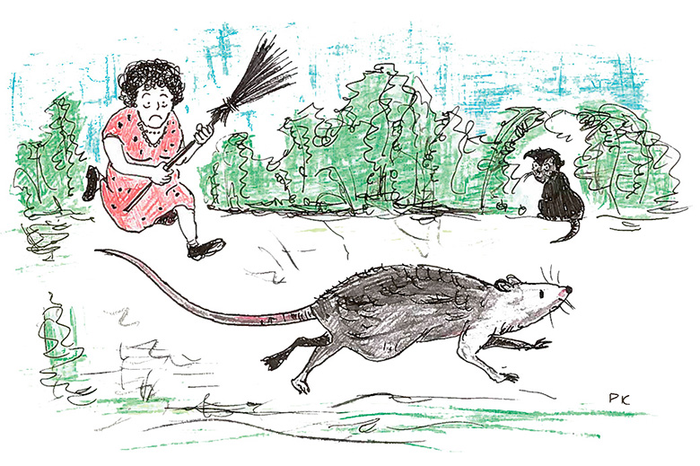 Tõnõ päiv naksimi sahvrit koristama. Katskidsõ as’a veimi lauda taadõ. Kilekotiga oll’ pinnele kaarajahu. Tuu oll’ kah värviga kuun ja mulk kah allotsan. Mõtli, et viska tuu är. Jõudsõ aian mõnõ meetri minnä, ku silm jäi koti pääle. Kotimulgust paistu roti pää. Mõtli, et om är koolnu, ja kõndsõ edesi. Ütekõrraga kae, et rotil vunts liigus. Pandsõ koti maaha ja võtsõ saina veerest luvva, et lüü roti maaha. Nii ku ma lähembäle jõudsõ ja tahtsõ kopsada, hüpäs’ rott mulgust vällä ja juusk’ keldri ussõ poolõ, nii et jahujutt takan. Kül ma kahitsi, et es astu jalaga pääle. A mis sa inämp tiit.