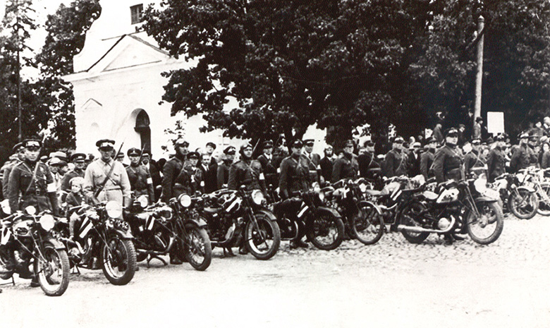 Eesti Kaitsõliidu tsiklimehe Võromaa malõva 20. aastapäävä paraati uutman 12. süküskuul 1937. Võro Katariina kerigu iin. Pilt om peri Vana-Võromaa kultuurikua muusõumist.
