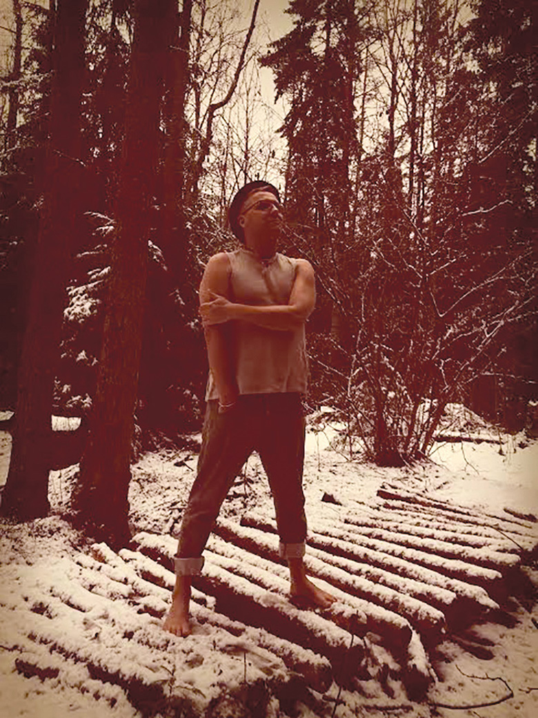 Lauri Arne sais pallidõ jalguga mõtsan lumõ seen puuvirna pääl. Pilt Lauri Arne eräkogost