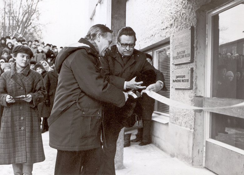 Täämbädse pildi pääl om hetk, kon Võro kodoluumuusõumi maja lindi lõikasõ läbi EKP Võru rajoonikomitee I sekretär Männiste Aare ja ENSV kultuuriministri edimäne asõtäütjä Mossi Ilmar. Näid avitas muusõumi noorõmbtiidrü Kengi Kaja.