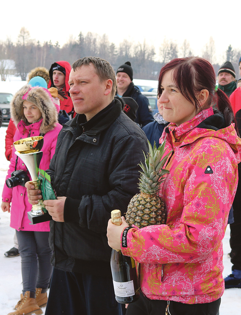Sõidu omma sõidõtu, õnnõligu kõrraldaja andva võitjilõ karikit ja avvuhindu kätte. Pildi pääl iin (hääd kätt) Jõgi Kersti, Kenderi Küllo ja näide perre kolmas võistlõja Kenderi Karin. Rahmani Jani pilt