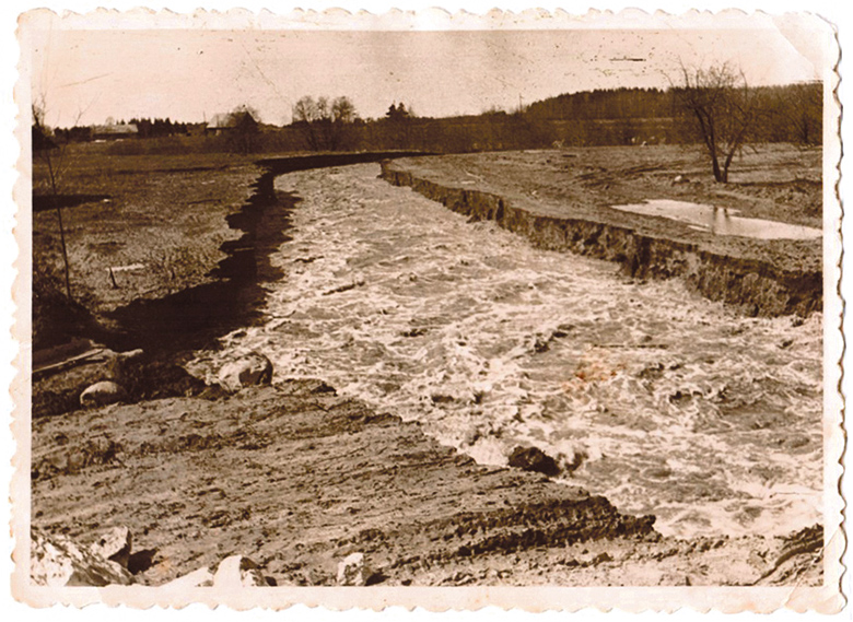 Ku kivikuurmagõ tammilõ jõudsõ, kästi tagurdõdõ sinnä lahkõ ligi ja mehe naksivõ kivve pildma. Lahe oll’ üle tii joba üle meetri lagja, noist kivest es olõ määnestki api. Mul es lubatõ autumootorit saisma jättä. Saisõ astmõlavva pääl. Ütekõrragõ kiäki röögät’: «Tõmba edesi!» Ku ma olli autu mõnõ meetri edesi saanu, vaiu kõik tuu tii, kon ma olli autugõ saisnu, alla ja läts’ jõõ poolõ. Inämp es olõ midägi pästä. Järv läts’ kohisõdõn allapoolõ ja vei indäge üten kõik, mis viiä andsõ. Ka suur betoonist tamm läts’ jõkkõ. Jõõ vesi tull’ nii üles, et uhtsõ lähikunnan kõik silla, sanna ja puuriida är. Tagula kandin uhtsõ suurõ hainamaa kah üle. Perän kuuldsõmi, et rahvas oll’ käünü hainamaa pääl kallu korjamõn.