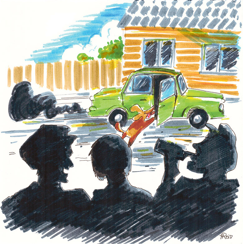 Jõudsõ küllä. Mitte üttegi inemist ega esiki pinni es näe. Õnnõ üts hobõnõ, kellege oll’ kah poodin käütü, sei keti otsan. Mõtli et küsü tuu vanamehe käest, kon tuu rohilinõ autu om. Koputi kül ussõ pääle, a kiäki es tii vällägi. Külän nigu es eläki pääle hobõsõ kedägi. Mis mul muud üle jäi ku esi külätanumit piten otsi. Ütekõrragõ nakas’ üts pini kavvõmbõl haukma. Naksi helü perrä mineme ja mõtli, et tuu kül Vinne pini ei olõ. Nu pakõsõ kuun pererahvagõ är, ku võõras küllä sisse tulõ. Noh ja näigi. Autu saisõ muru pääl ja sääl kõrval võrkaid ja Murka aian ketti pantu.
