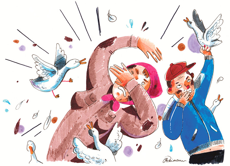 Ega tuu ajaminõ kerge es olõ. Pardsi vehkli siibugõ ja sittõvõ trepi nilbõs. Üte kuurma saimi piaaigu üles. Naksimi tõist kuurmat ajamõ, ku näimi, et üts naanõ tulõ suurõ kärugõ üles trepi otsa manu ja jääs kaema. Tä valasi kärutävve vett trepi pääle meile vasta. Tuu juussõ kõik treppi pite allapoolõ. Sõs läts’ asi peris hullus, es püsü esi ega pardsi sääl sita seen pistü.