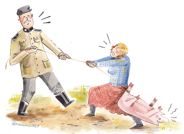 Kesküü paiku kuuldsõmi lähküst räginät. Imä hõigas’ saksa ja vinne keeli, et siin omma rahuligu elänigu, pallõsi mitte laskõ. Vasta kostsõ: «Möö!» Tuu oll’ mi aiast koosõrdama päsnü vasik, kiä nüüd pernaasõ helü pääle rõõmsadõ manu tull’.