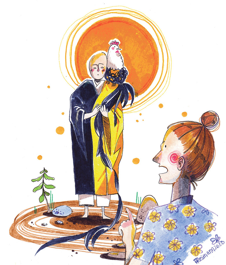 Trehvü nii, et tuu naistõrahvas läts’ Jaapanit avastama. Tälle näüdäti sääl ütte-tõist ja tükü kolmandatki, koonis naistõrahvas küsse, määndse omma Jaapani kana. Näüdäti pilte, aga naistõrahvas tahtsõ eläviid kannu nätä. Viidi sis ütte koloostridõ ja ülti, et sääl arõtõdas kannu, kel hand üle kümne miitre pikk. Et kana ollõv jaapani keeli dori, aga tõug ollõv siiämaani viil ilma õigõ nimeldä. Naistõrahvas muiduki kibõli noid imelindõ kaema, aga hoiatõdi, et kümnemiitrene hand om ainult kikkal. Viidi tä sis ütte kloostriaida, kon paistu kavvõdast määnegi kuju vai avvusammas. Naanõ läts’ ligembäle ja näkk’, et tuu sammas oll’ munk, kiä üttegi elumärki vällä es näütä. Tuu iist istõ timä ola pääl kikas, kiä võõrast näten kõrraga kirgmä nakas’. Kikkal tull’ üts väiku sulõkõnõ valla ja linnas munga nõna pääle. Mii turist pand’ tähele, et sulõkõnõ nõna otsan liiku, tuu lubasi luuta, et mungal õks elu seen. Naistõrahvas läts’ peris lähküle ja näkk’, et munga mõlõmba käe hoiti kikka hannasulgi. Hand võisõ esi vabalt kümme miitret pikk olla. Naistõrahva imestüs pässi suust vällä selgen eesti keelen: «On aga dori!» Jaapanlasõ kikiti tuu pääle kõrvu ja palssivä üteldüt kõrrata. Naanõ vahtsõst: «On aga dori!» Jaapanlaisi näo lätsi tuu pääle särämä ja nakati ütstõsõlõ õnnõ suuvma: tõulõ oll’ löütü kõrralik nimi. Tull’ vällä, et onaga om jaapani keeli pikk hand, sinnä viil dori manu ja omgi «Onagadori», miä võru keeli om «pikä hannaga kana».