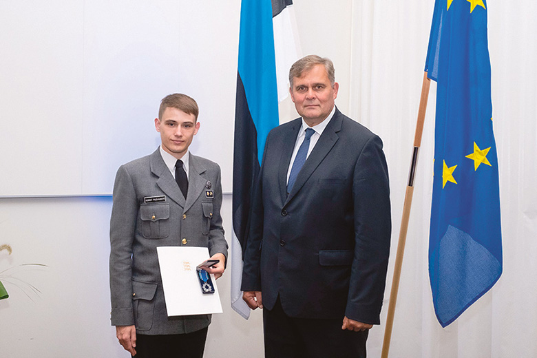 Pazuhanitši Romet avvumärgi kättesaamise pääväl üten justiitsministri Aegi Raivoga. Urbi Aroni pilt