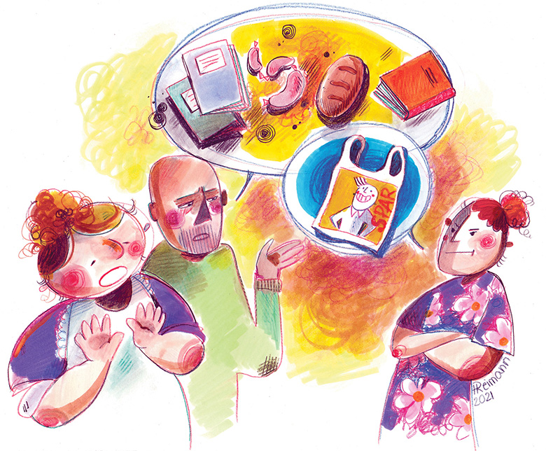 «SPAR-miis» põrmandu pääl, pruuvsõva imä-esä sõs mullõ, ullilõ latsõlõ, selges tetä, et plastmassist koti iist kolm ruubilt massa om ull’us kuubin, ku vihu masva kats kopkast, raamadu paarkümmend, leeväpäts katstõist ja kilu vorsti kats katskümmend. Juttu sai aetus pikält ja kirglidselt, a koti ma hindäle vällä kõnõli.