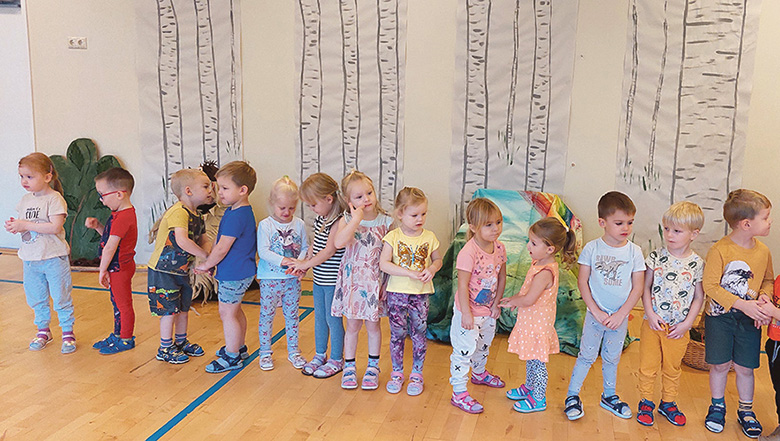 Tuud kõkkõ käve keelepesä oppaja Helle ja Pille egän aiarühmän latsiga hummogutsõõrin arotaman. Üten võeti tränikast, mille kraamist saiva latsõ mõnda eläjät kujota. Sääne hindä luumisõ lugu miildü näile väega. Üts rühm nakas’ õkva träni koguma. Muusigaoppaja Kätlin opas’ tervele latsiaialõ «Lõvijahi» laulu ja maaha sai peetüs Pihlapuu VI uma pido. Päätegeläne oll’ jänes, kellel tõsõ hää mõtsaeläjä lubasi olla eläjide kuningas. A jänes sai arvu, et hää om iks olla esihindä muudu.