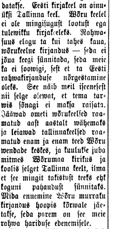 Ku seol mi imäkeele kõrvalõtoukamisõl umma joba nii vana ja tah nimmatust viil vanõmbagi juurõ, sis olõ-õi joht midä imehtä, et täämbätsel pääväl võro keele haridustõ, meediähe jm ütiskunnaello ni läbi tuu perrihe tagasi tuuminõ käü nii vastavuulu ja vaivalidsõlt. Keele vahtsõst ellotuumist kisk kõva jovvuga tagasi pia paarisaa aastaga vastapididse tüü ja mõttõ ehk võro keele välläjuurmisõ inerts.