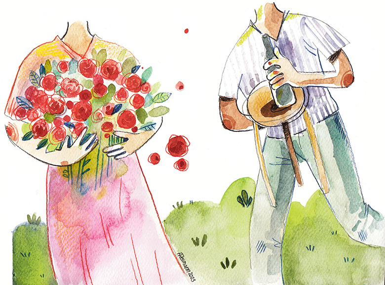Viil kolmanda pulma kah olliva. Sinnä oll’ mi kamp kah kutsutu. Pulma olli koolimajah. Tuust teimi poodi man joba varramba juttu. Ku mi pulmaliidsiga poodi mano jõudsõmi, näimi, et auväretiid es olõki. Mehe olli kül sääl ligi hobõsõga ja kõoki vankri veereh. Mehe kummuti viil pudõlit. Pulmaliidsi näteh haari kõo kätte, a jäivä tuuga iks ildas. Tuugipoolõst es jätetä näid rohost ilma.