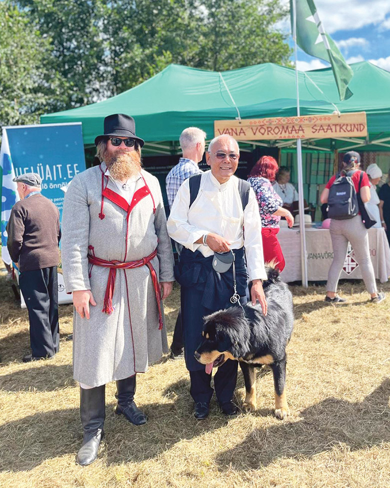 Võro instituudi direktri Kuuba Rainer ja dalai-laama eriesindäjä Frasi Sonami üten Strideri Roy Tiibeti mastifi tõugu pini Nyimaga Vana-Võromaa saatkunna man. Strideri Roy pilt