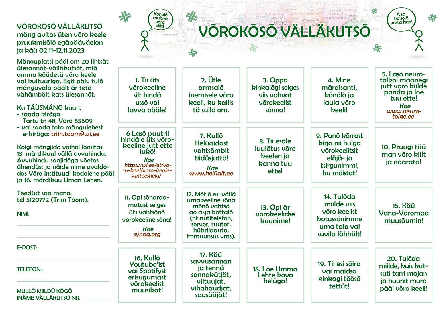 • 7.11 kell 17.30 om Võro instituudin võrokiilne ja -miilne mälomäng.