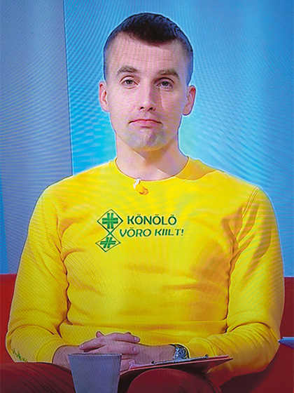 ETV «Terevisiooni» saatõjuht Kilumetsa Juhan tekk’ hummogusaadõt võrokeelidse kiräga hammõn. Pilt ETV ekraani päält