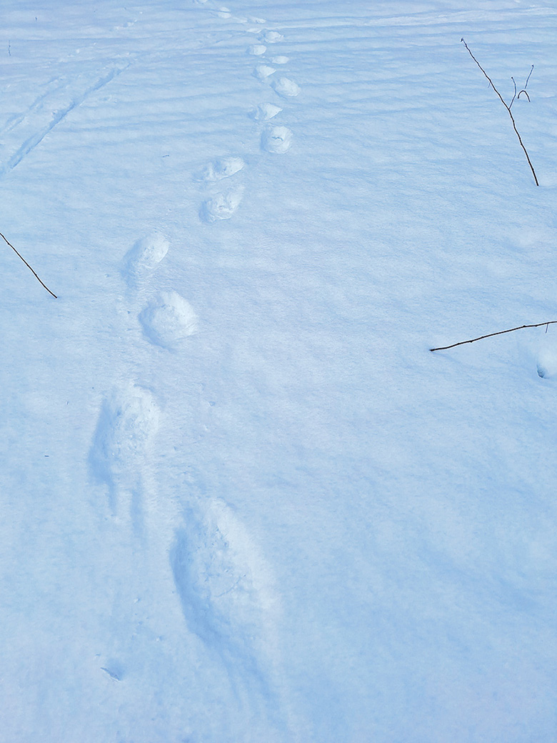 Üüse oll’ tsipa lummõ sadanu ja kõik jäle väega värski. Panni tähele, et mu mõtsast tulõva suurõ eläjäjäle. Ligembäle suusatadõn näi, et nuu omma kahrujäle. Mõtli, et radokuu 6. päiv om kahru heränemises viil tsipa varra.