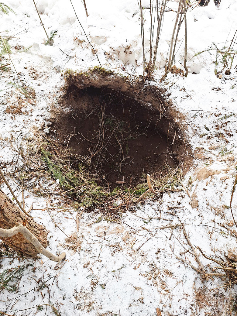 Päält pikkä otsmist löüdse pesä kah. Arvada või, et tego oll’ noorõ, kolmõ–nelä-aastadsõ esäkahruga, selle et jäle olli umbõs 14 sendimiitret lagja. Kahr oll’ kraapnu üte väiku pedäjä ala nõlva sisse tsõõriku mulgu, voodõrdanu tuu mõnõ kuusõossaga ja oll’gi kõik. Väega lihtsä pesäkene.
