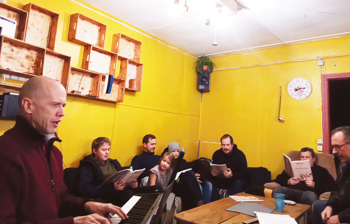 Kärgula kunnakuur proovin. Pildi pääl om miihinukk, klavõri takan oppaja Kaumanni Tõnis. Bosi Daani pilt