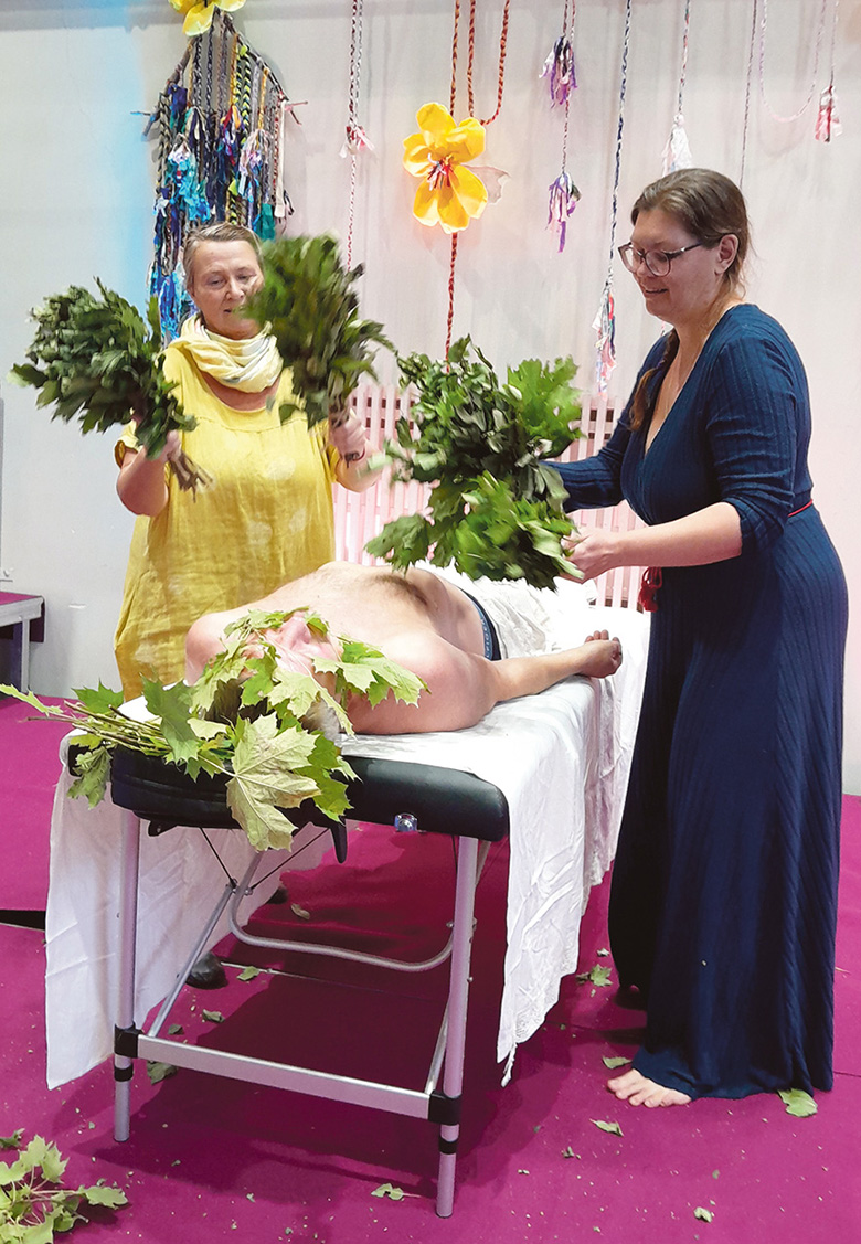 Muusiän teiva kuivalt vihtlõmisõ ettenäütämise Võromaa sannanaasõ Tuisu Ene ja Taali Kati. Katõl käel alanu vihtlõminõ lõppi neläl käel. Vihõldav oll’ kotusõpäälne priitahtlik, kiä ütel’ perän, et tunnõ oll’ nii õnnis, nigu olõs pilve pääl är käünü. Vihaga sopsmisõ mano käve ka väiku soonõtasominõ, vehvermentsivii pääle pritsmine ja apõlsiniõli nuhega hellätämine. Noist katõst viimätsest saiva ossa ka nuu, kiä nõnnapite talitusõ man vaheva.