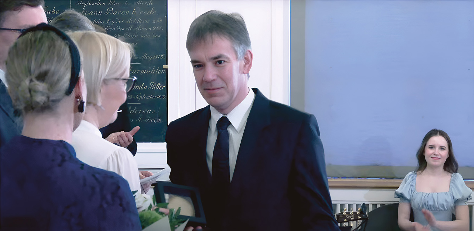 Laanõ Valdis korgidõ riigisaksu käest tiidüspreemiät vasta võtman. Pilt tiidüspreemijide üleandmisõ avvutallitusõ videost