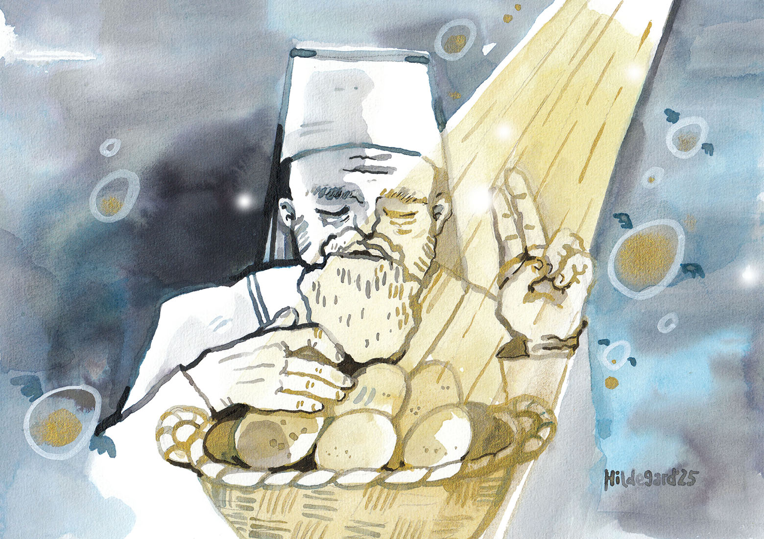 Nätäl ildampa käü kerikun liturgia. Priistre om jutlusõga nii huun, et pand viil perämädsel hetkel aknõlõ kaiõn tähele Lambasuu Partsi hobõst ja vankrõperän paistuvat munakorvi. «Kellä-miis, kellä-miis, tu-lõ tor-nist al-la, Lam-ba-suu – Parts tull’ – jo – mun-nõga,» poetas tä üten hospodiiga teedüsse vinne kerigulaulu viie sekkä. Selle, et kellämiis om vast magama jäänü vai uma lubamisõ är unõhtanu. Viil kolmandal kõrral, ku jutlusõ ütlejä om kundsaga vasta kerigu põrmandut põrutanu, nakkas kellätornin kopin pääle. No lätt heränü kellämiis munakorvi vasta võtma.