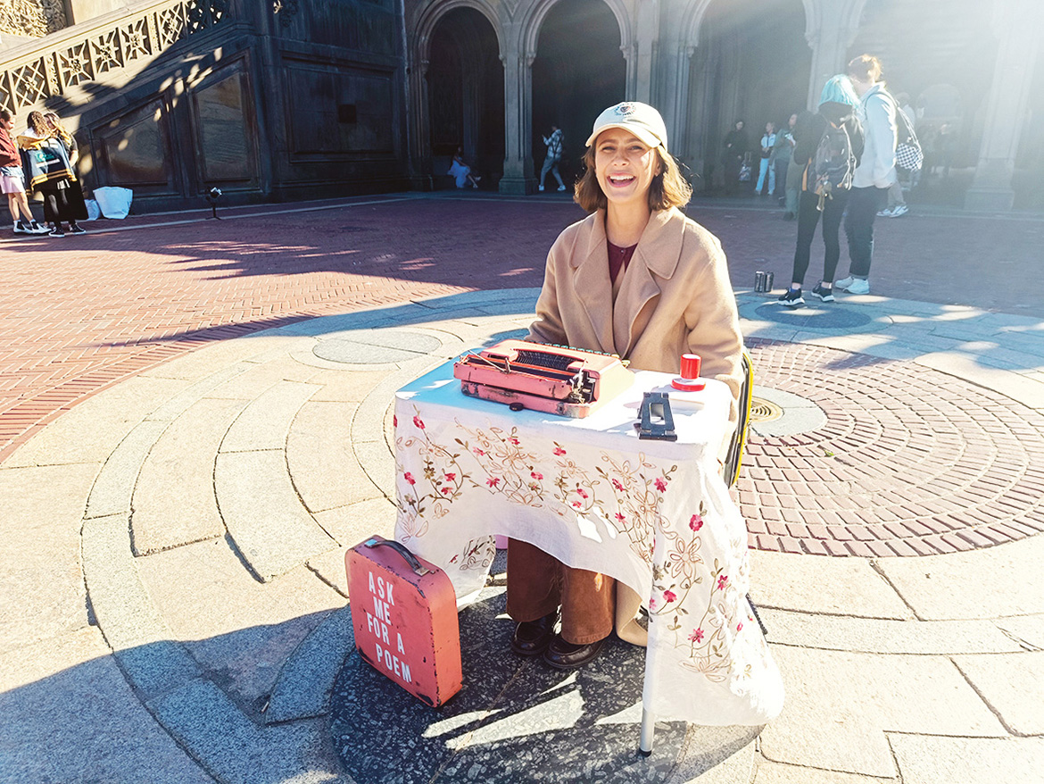 Tütrik kirotusmassinaga Centrali pargin. «Küsü mu käest luulõtust!» om timä kohvri pääle kirotõt. Küsüt ja tä trükk trükümassinaga väiku annõtusõ iist tuu paprõ pääle. Eesti kultuuriatašee Madli-Liis Partsi sõnnu perrä om New York väega kirändüssõbralik liin. Laanõ Triinu pilt