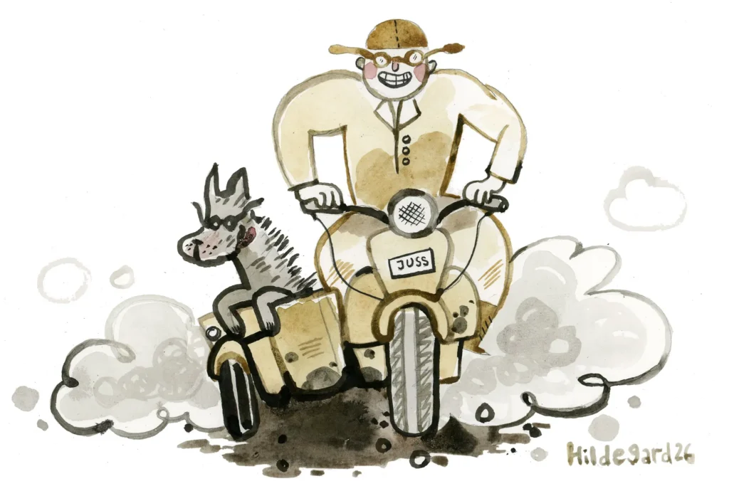 Nigu joba nimmatus sai, oll’ Juss kõva jahimiis kah. Sõbrast pini tsikli korvi ja mõtsa poolõ minek. Harva, ku tagasi pidi tulõma tühä kotiga. Seokõrd oll’ jälle vidänü ja jänespoiss rännäs’ panni pääl ahjo. Sidenaisilõ ütel’, et lätt poodi manu (egä sõs praati tsia muudu süvvä saa-i) ja kaegu nuu perrä, kuna praat valmis saa. Praat sai valmis – Jussi ei koskil. Ju sai sõs sõpruga kokko. Naksiva esi pruuvma ja ku Juss ütskõrd kodo jõudsõ, olli õnnõ kondi perrä.