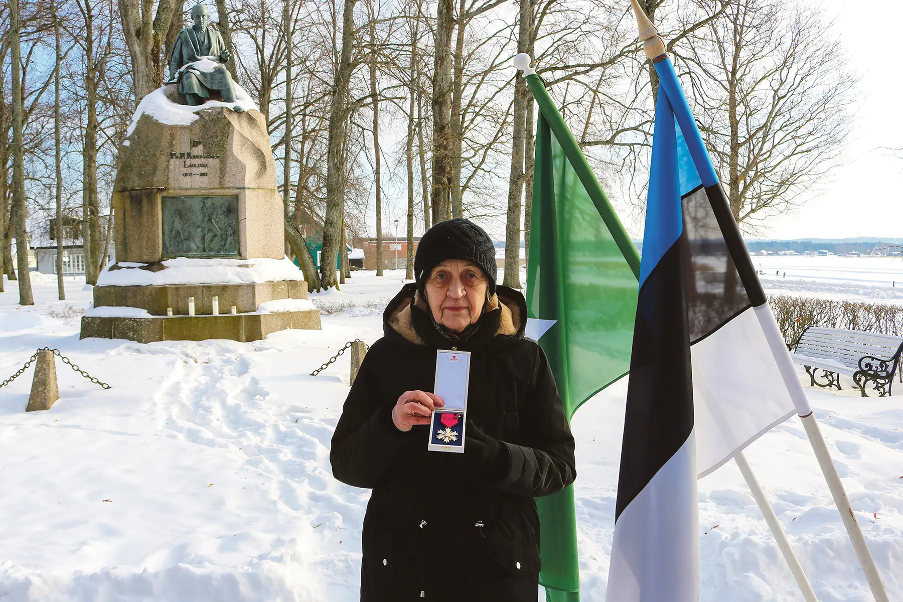 Kreutzwaldi muusõumi juhataja Hollo Aimi sai presidendi avvomärgi kätte 19. radokuul 2026 Võrol Kreutzwaldi mälehtüssamba man. Rahmani Jani pilt